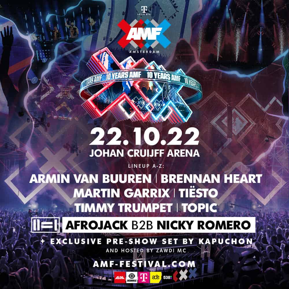 El sábado 22 de octubre los mas grandes se suben al escenario. Además este año AMF cumple una década y lo hará con Armin Van Buuren, Brennan Heart, Martin Garrix, Tiësto, Timmy Trumpet, Topic y un B2B de Afrojack junto a Nicky Romero. Todos sabemos que de ahí pueden salir chispas!