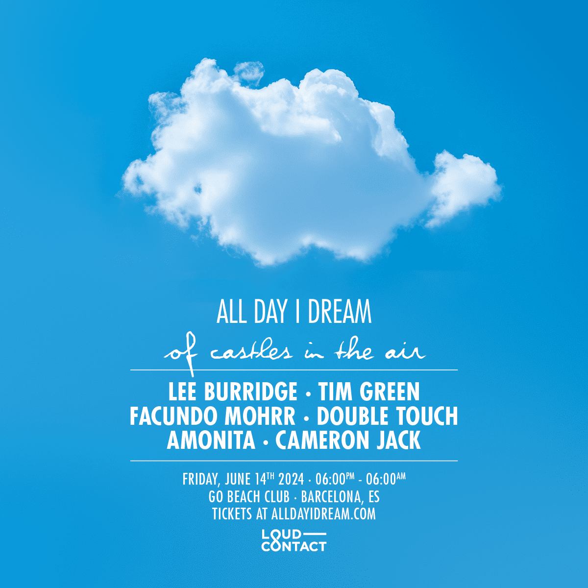 Antes de que el verano llegue a su apogeo y All Day I Dream se instale en su residencia ibicenca en Playa Soleil del 15 de junio al 21 de septiembre, Barcelona tendrá el privilegio de disfrutar del concepto más espectacular de Lee Burridge el 14 de junio en Go Beach Club. El show empieza a las 18h y se extenderá durante las siguientes 12 horas de forma ininterrumpida.