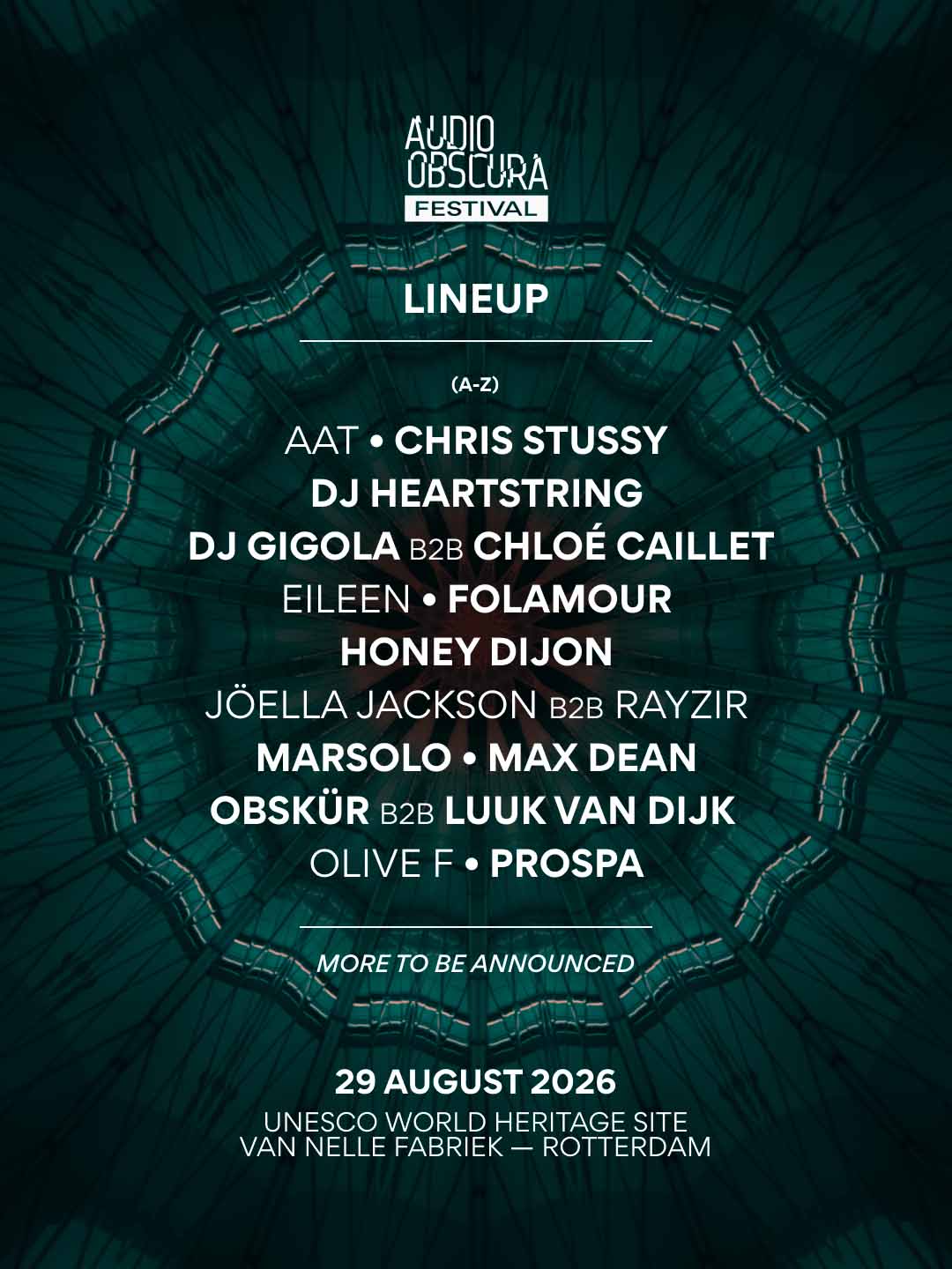 La primera edición en la Van Nelle Factory se celebró en 2024 y agotó todas las entradas. Aquella jornada convirtió la antigua factoría en un recinto híbrido, con programación indoor y outdoor y un total de cuatro escenarios. La experiencia se organizó como un itinerario dentro del complejo, con puntos neurálgicos en zonas industriales y estructuras elevadas que normalmente cumplen funciones logísticas. Ese planteamiento es clave para entender por qué Audio Obscura insiste en definir su festival como una instalación efímera. Solo existe durante un día, y luego desaparece.