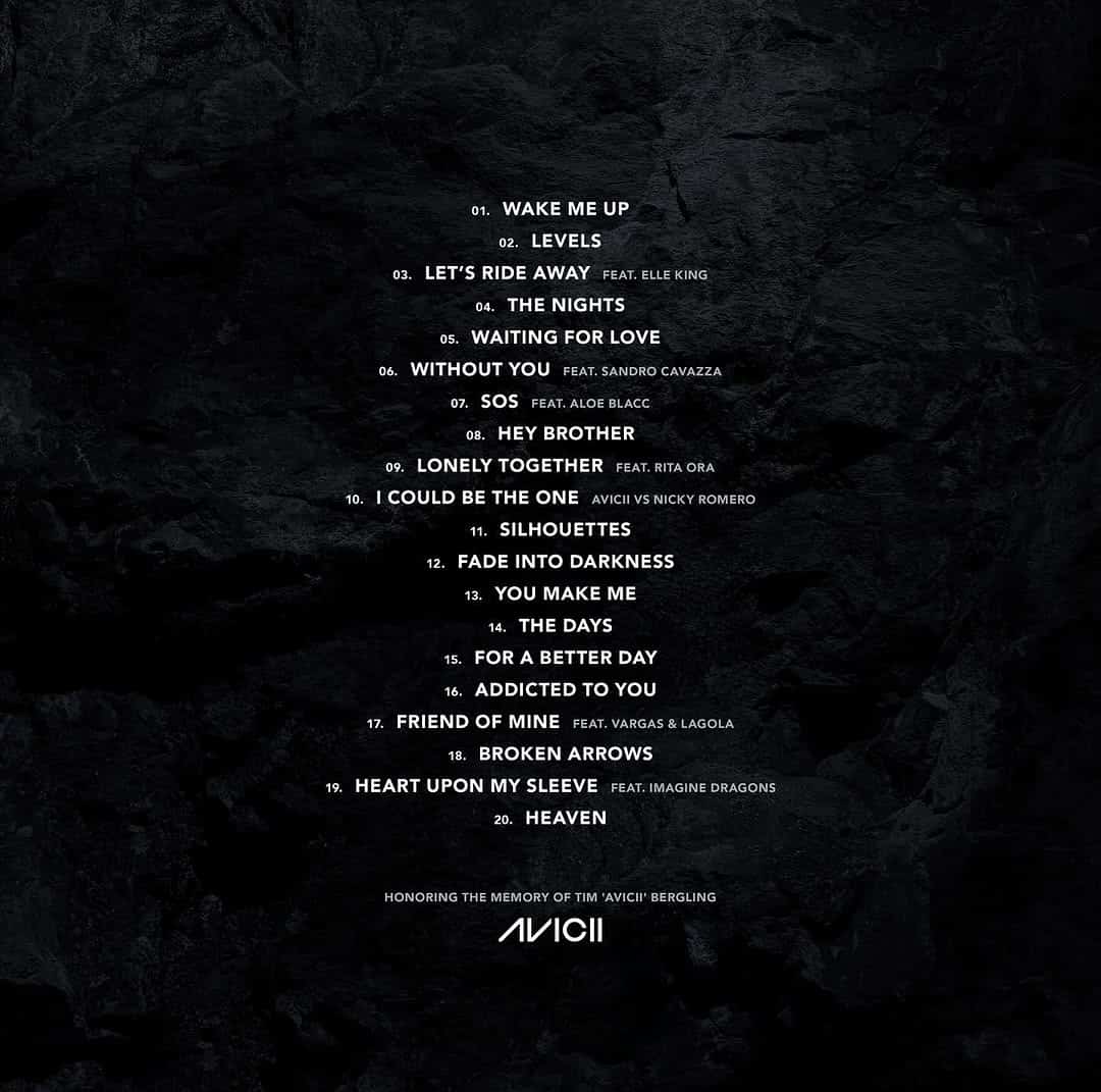 El álbum, disponible tanto en edición digital como en formatos físicos (CD y vinilo), incluye clásicos como «Wake Me Up», «Hey Brother«, «Waiting for Love» y «Levels«, junto a colaboraciones con Aloe Blacc, Rita Ora, Sandro Cavazza, Imagine Dragons y otros artistas clave en su carrera.
