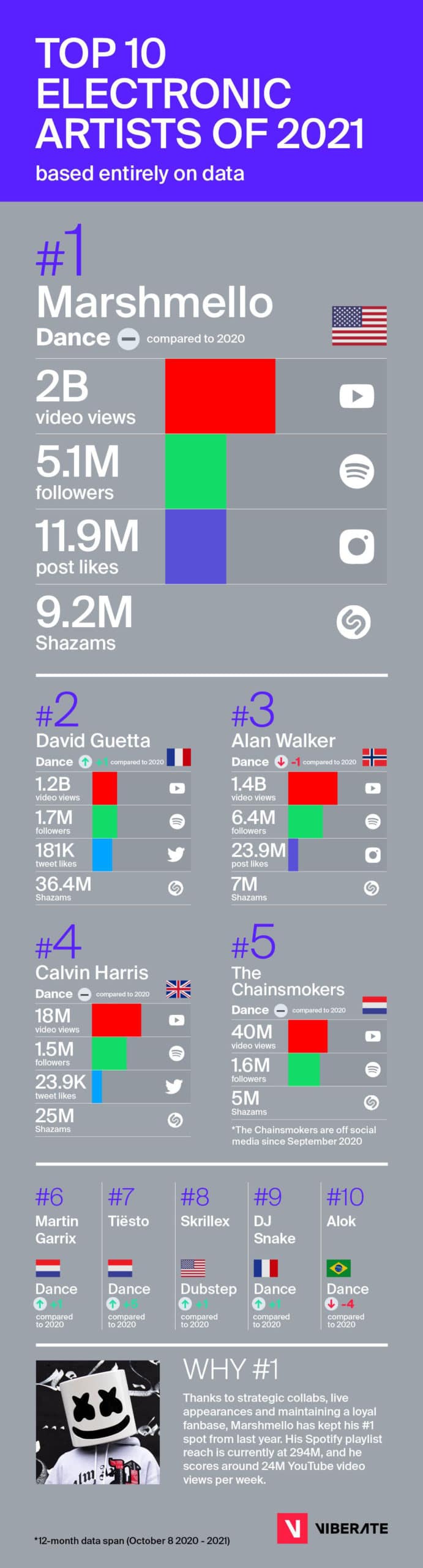 Tras analizar los resultados de 2021 con respecto a los obtenidos en el año 2020, Viberate concluye que David Guetta es popular, pero no el más popular. Marshmello se corona como el DJ más popular al igual que ya lo hizo en el 2020, le siguen de cerca David Guetta, Alan Walker, Calvin Harris y The Chainsmokers. Para concluir el Top 10 se unen a ellos Martin Garrix, Tiësto, Skrillex, DJ Snake y Alok.