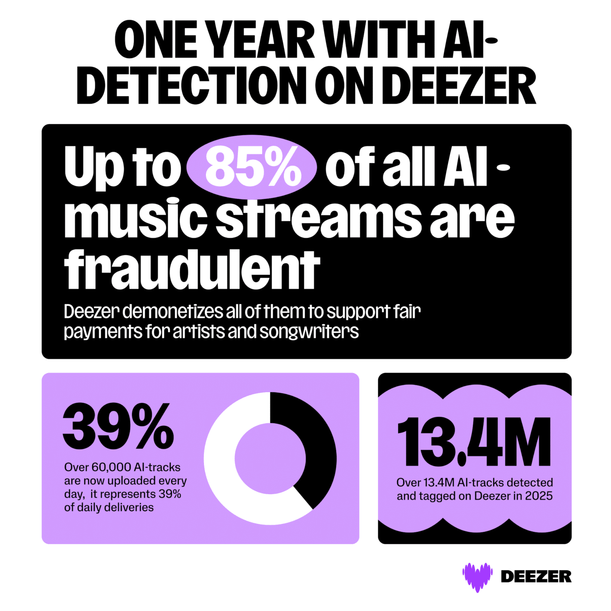 Es un salto brutal frente a las cifras publicadas anteriormente. Por ejemplo, a comienzos de 2025 se hablaba de 10.000 temas diarios (alrededor del 10% de las subidas). Más tarde, en 2025, actualizó el ritmo a 30.000 al día y un 28% del total de entregas. Ahora eleva de nuevo la referencia y añade un acumulado: más de 13,4 millones de pistas IA detectadas y etiquetadas en 2025.