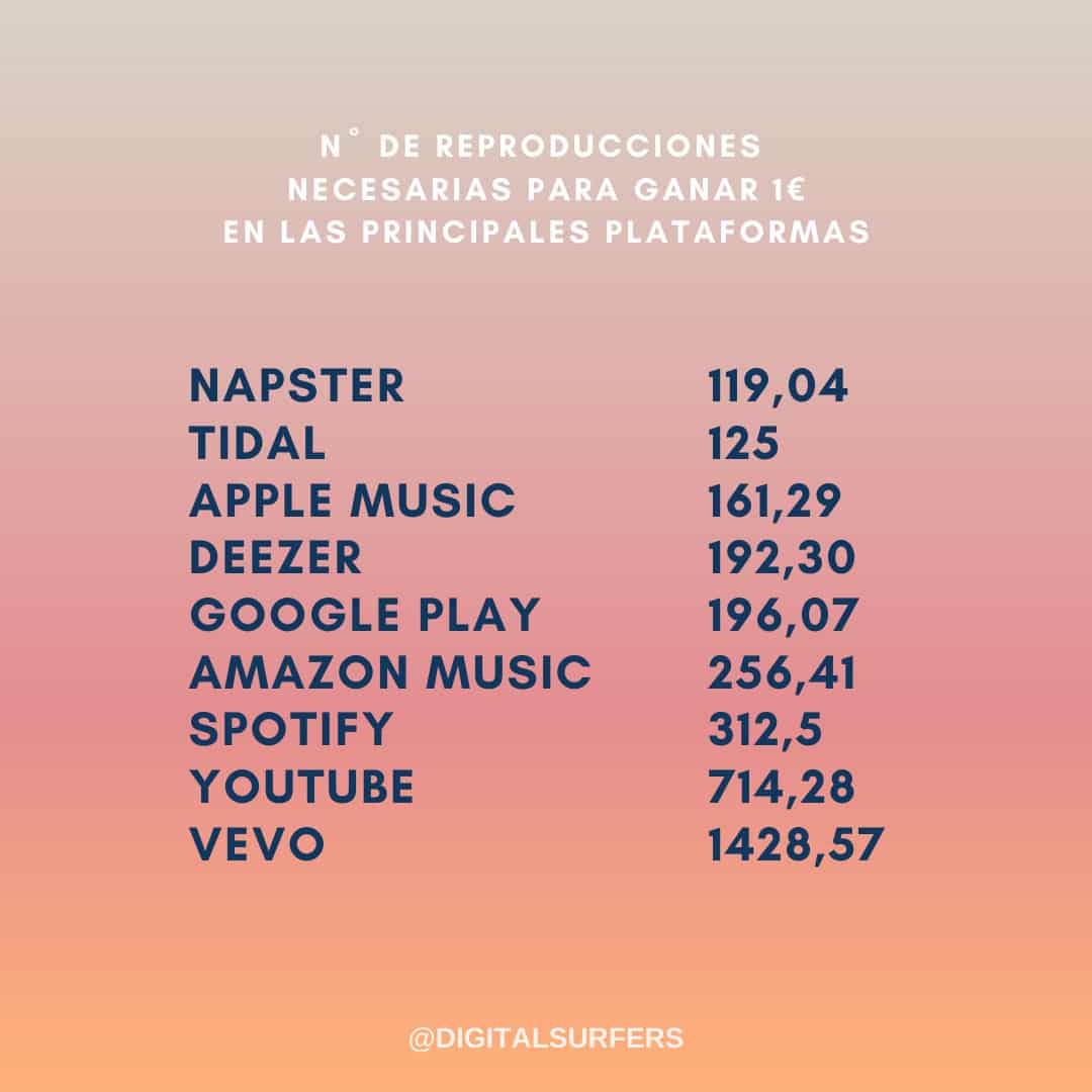 Para ponerlo todo más claro, os dejamos una gráfica que han creado en Digital Surfers para demostrar cuantas reproducciones necesita un artista para ganar 1€ en las principales plataformas de música bajo demanda. En la gráfica encontramos Napster, Tidal, Apple Music, Deezer, Google Play, Amazon Music, Spotify, Youtube y Vevo. Aunque hay otras plataformas como Facebook que actualmente paga 0,0525€ por reproducción y Tik Tok, que no aparece en este estudio.