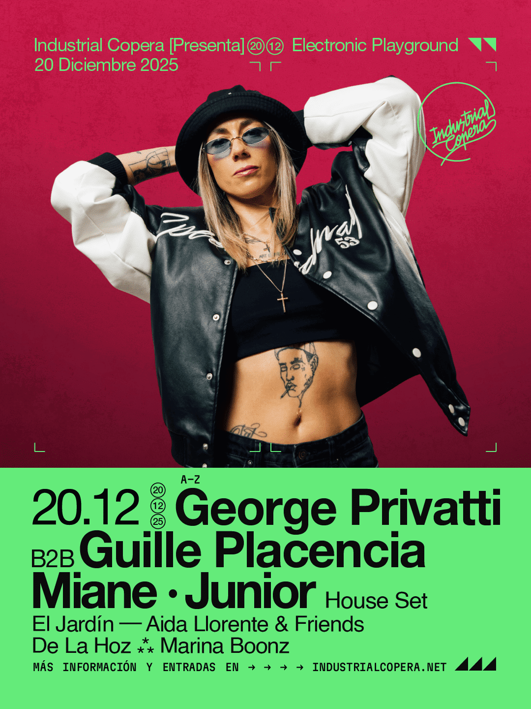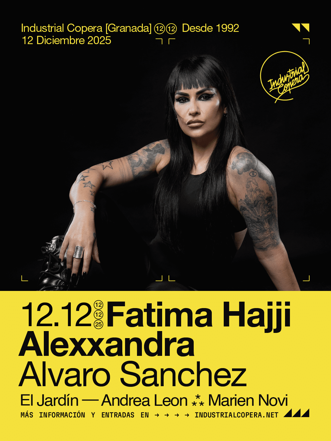La semana siguiente, el viernes 12 de diciembre, llega una de las artistas más esperadas. Fatima Hajji actuará en Industrial Copera en un momento clave de su trayectoria internacional. Su techno rápido y contundente, conocido por la precisión técnica, marcará la noche junto a Alexxandra, proyecto paralelo de la artista de Delaporte centrado en el lado más oscuro del género. El cartel se completa con Álvaro Sánchez, habitual del club, y en El Jardín con Andrea León y Marien Novi, dos propuestas conectadas con las nuevas corrientes electrónicas.