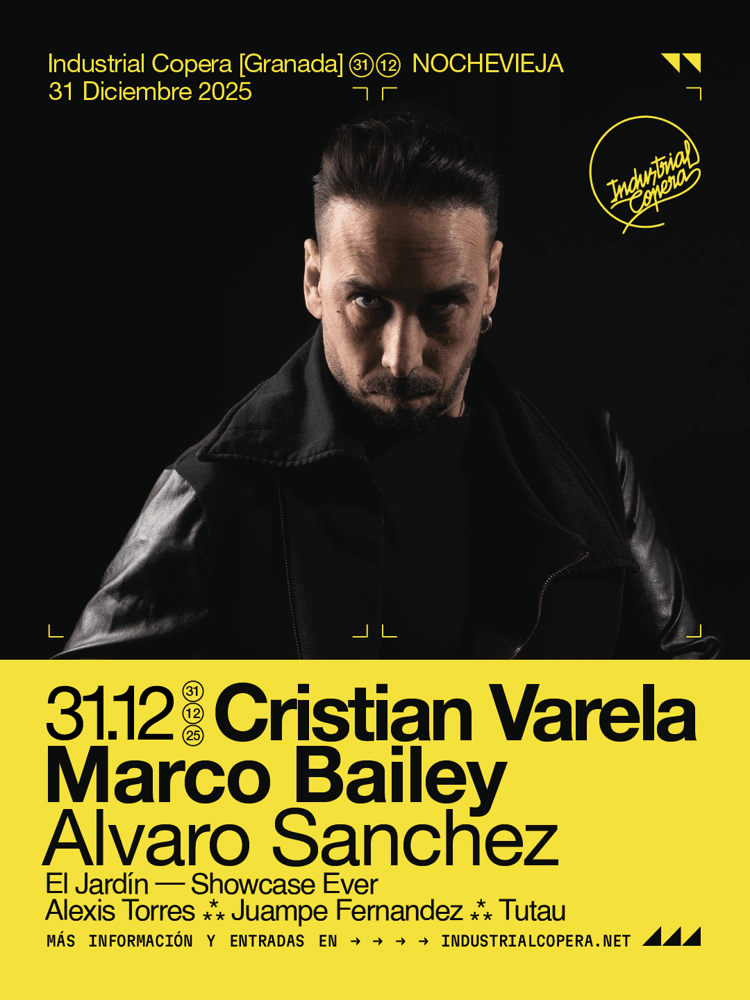 Para Nochevieja, el miércoles 31 de diciembre, Industrial Copera propone uno de los encuentros más esperados: el b2b entre Cristian Varela y Marco Bailey. Dos figuras históricas del techno que cierran el año con una sesión conjunta pensada para marcar época. Antes de ellos actuará Álvaro Sánchez, y en El Jardín lo harán Alexis, Juampe Fernández y Tutau, garantizando un final de año con sonido impecable.