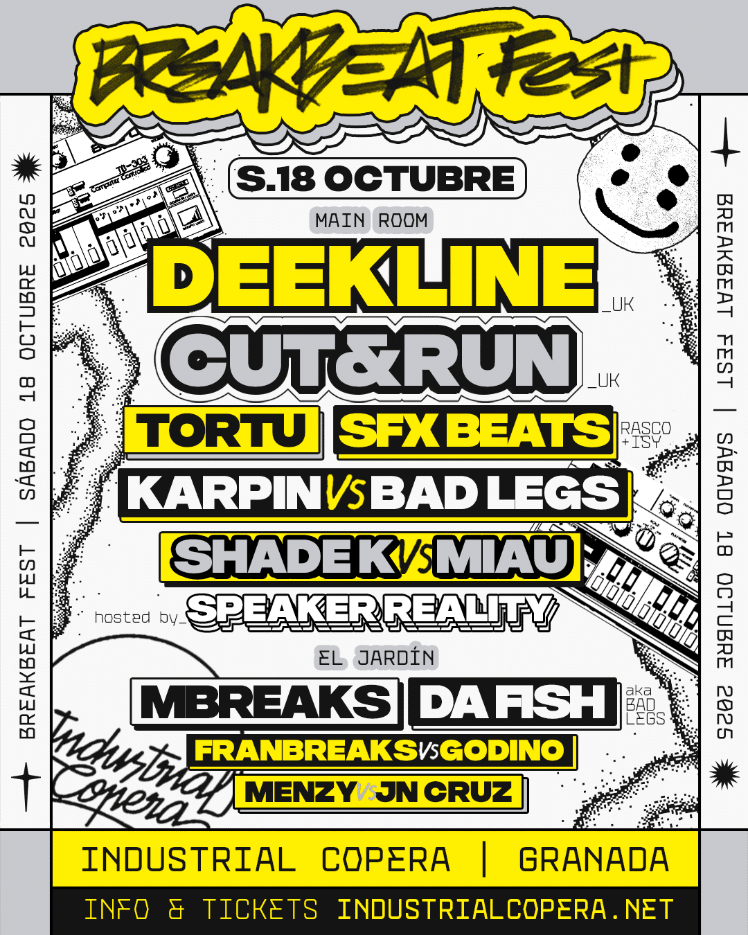 El cartel de la noche incluye a figuras reconocidas como Deekline y Cut&Run, acompañados por Tortu SFX Beats, Karpin vs Bad Legs, Shadek vs Miau y Speaker Rality. En el espacio de El Jardín, la música continuará con las actuaciones de Mbreaks, Da Fish, Franbreaks vs Godino y Menzy vs JN Cruz. Una programación que promete mantener viva la esencia festiva y desenfadada del género.
