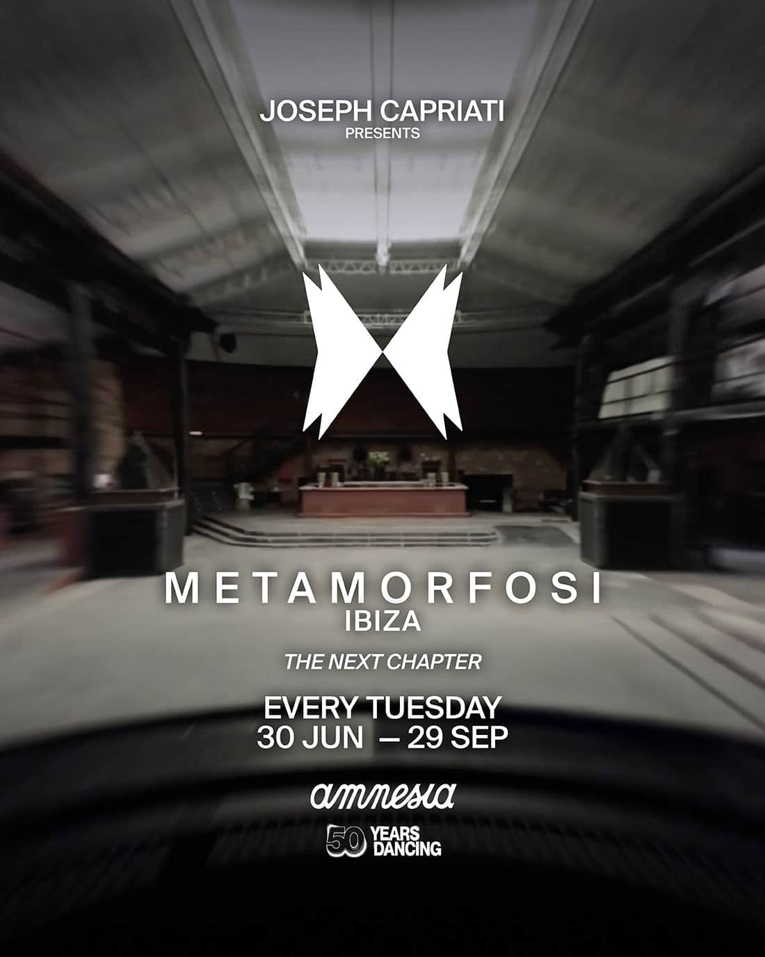 La residencia de Metamorfosi se celebrará todos los martes desde el 30 de junio hasta el 29 de septiembre de 2026, con 14 fechas consecutivas. Se trata de la estancia más extensa de Joseph Capriati en Amnesia, un regreso planteado como nuevo capítulo del proyecto y ligado a la idea de volver “al lugar donde todo comenzó”.