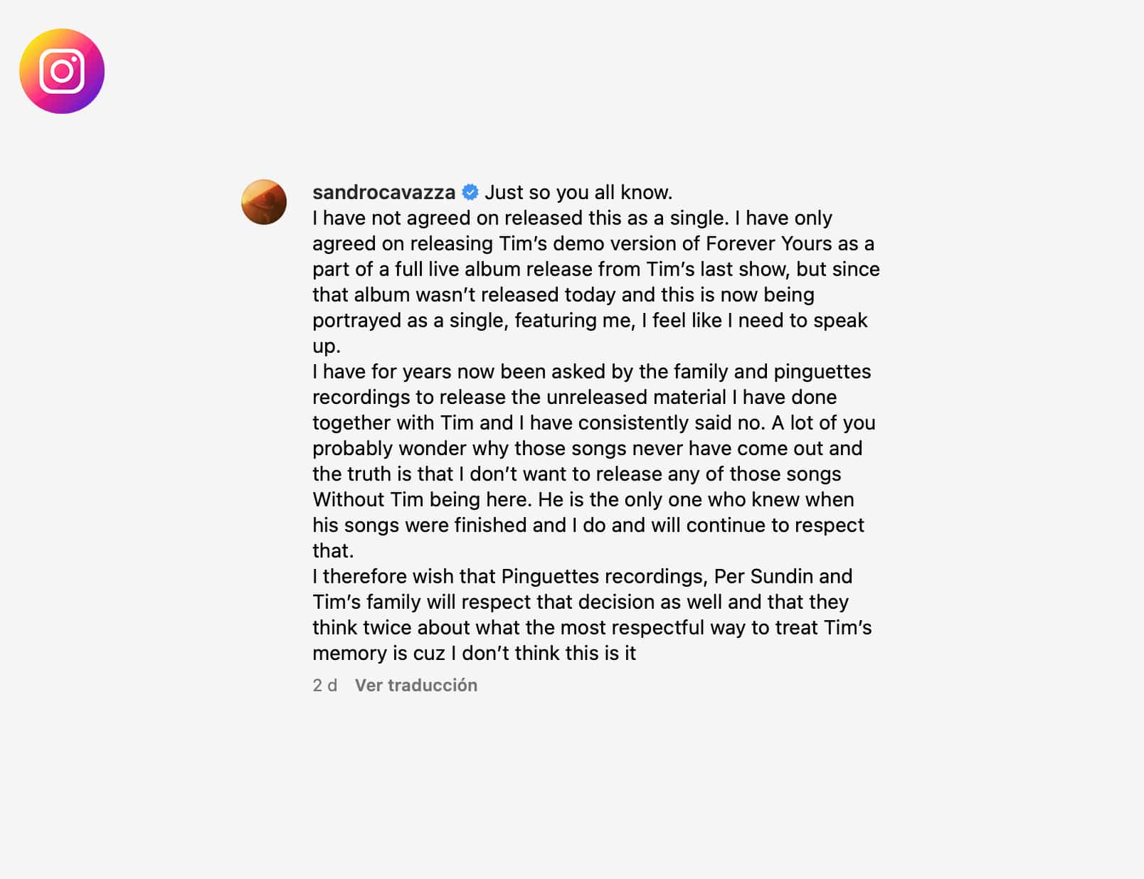 También explicó su postura sobre el material inédito: «Durante años, la familia y Pinguettes Recordings me han pedido que publique las canciones no lanzadas en las que trabajé con Tim, y siempre he dicho que no. Muchos probablemente se pregunten por qué esas canciones nunca han salido a la luz, y la verdad es que no quiero publicarlas sin que Tim esté aquí. Él era el único que sabía cuándo sus canciones estaban terminadas, y yo respeto y seguiré respetando eso».